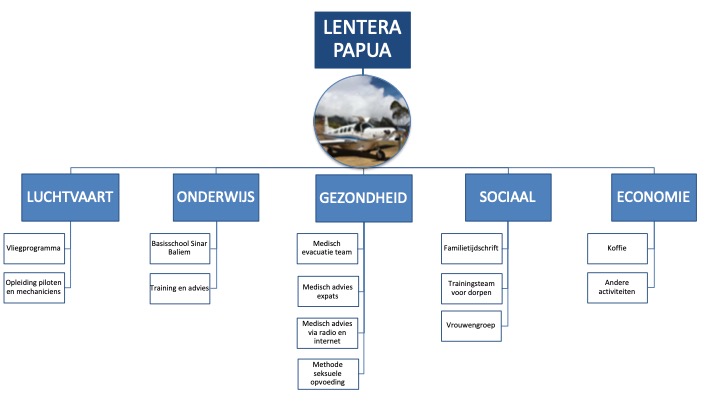 Gestart vanuit het vliegprogramma, zijn de taken van Lentera uitgebreid naar dienstverlening op het gebied van onderwijs (een kleuter- en basisschool), gezondheidszorg (medische evacuaties, advies en een lesmethode), sociaal werk (een gezinstijdschrift en trainingen), en economie (koffie, transport met de vrachtwagen). Centrale spil is het vliegprogramma; niet alleen voor de inkomsten en training van piloten en monteurs, maar ook om in dorpen te komen en bijvoorbeeld koffie uit dorpen op te halen.